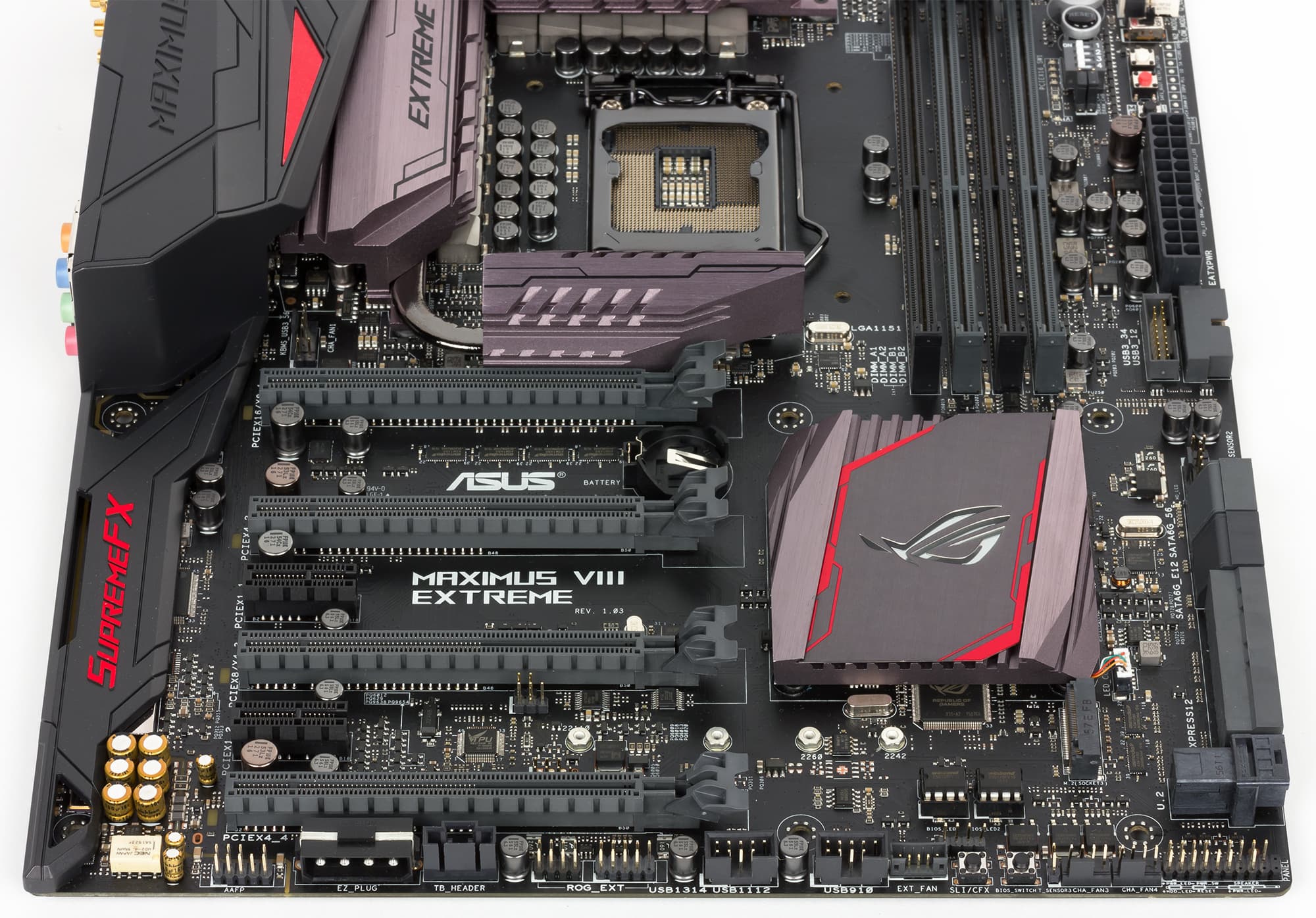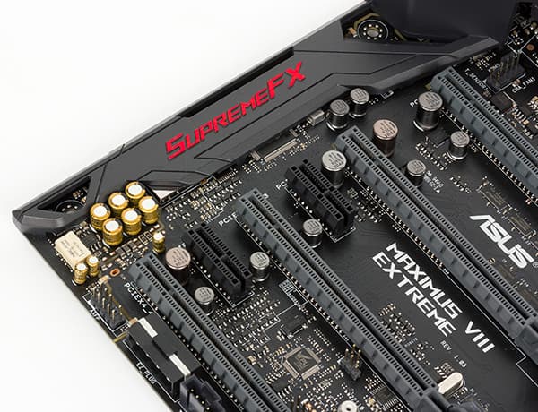 Аудиоподсистема материнской платы Asus Maximus VIII Extreme, как и всех плат серии Maximus VIII, имеет маркетинговое название SupremeFX 2015. Она включает в себя популярный 8-канальный (7.1) HDA-аудиокодек Realtek ALC1150 (он закрыт металлическим кожухом с надписью SupremeFX). Кроме того, в аудиотракте используется ЦАП ESS SABRE ES9023P, специализированный усилитель для наушников RC4580, конденсаторы Nichicon и прочее. Все элементы аудиотракта изолированы на уровне слоев PCB от прочих компонентов платы и выделены в отдельную зону.