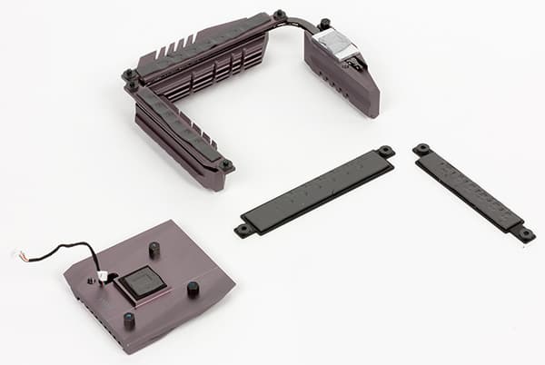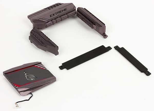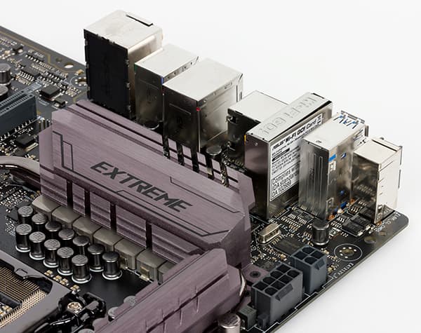 Система охлаждения платы Asus Maximus VIII Extreme включает в себя два радиатора. Один радиатор состоит из трех частей, связанных тепловой трубкой. Этот радиатор в форме буквы «П» установлен с трех сторон процессорного разъема и охлаждает MOSFET-транзисторы и коммутатор ASMedia ASM1187e. Еще один радиатор закрывает чипсет Intel Z170.