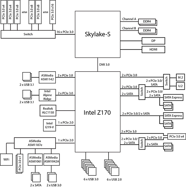Непосредственно к чипсету Intel Z170 подключены: слот PCIe 3.0 x4, разделяемые разъемы M.2/U.2/SATA Express, отдельный разъем SATA Express, контроллеры ASMedia ASM1142 и Intel Alpine Ridge, сетевой контроллер Intel i219V. Кроме того, непосредственно к чипсету подключается и сам коммутатор ASMedia ASM1187e.