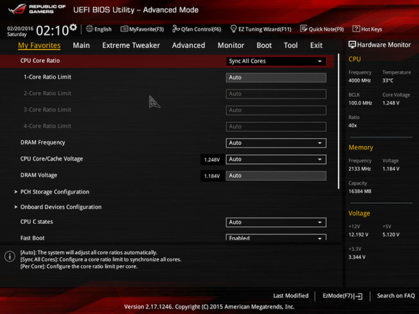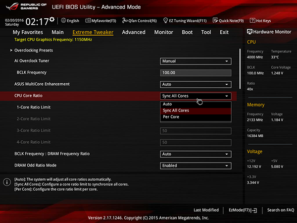 В качестве примера отметим, что на плате Asus Maximus VIII Extreme мы разогнали наш экземпляр процессора Intel Core i7-6700K до частоты 5,0 ГГц при использовании воздушного охлаждения. Разгон процессора производился только путем изменения коэффициента умножения одновременно для всех ядер процессора.