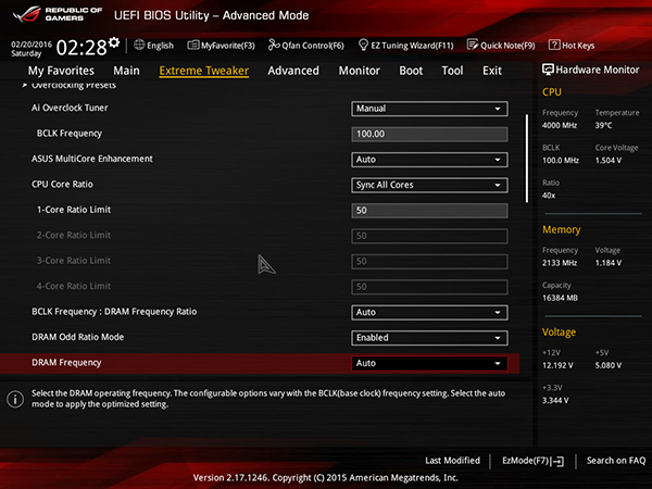 Кроме коэффициента умножения ядер процессора (CPU Core Ratio) и частоты BCLK (BCLK Frequency), в настройках AI Tweaker можно задавать коэффициент BCLK Frequency : DRAM Frequency (100:100, 100:133) и настроить работу модулей памяти.