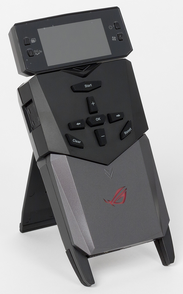 Данная панель подключается специальным кабелем к соответствующему разъему на плате (задействуются одновременно разъем ROG_Ext и один разъем для подключения USB 2.0 портов). Кабель, нужно отметить, не очень удобный. Он довольно толстый и жесткий и не позволяет удобно разместить панель на столе.