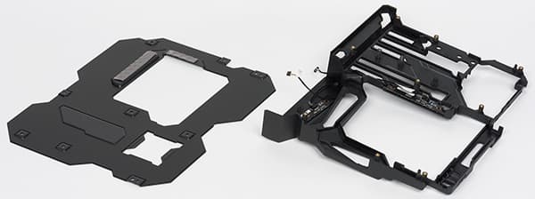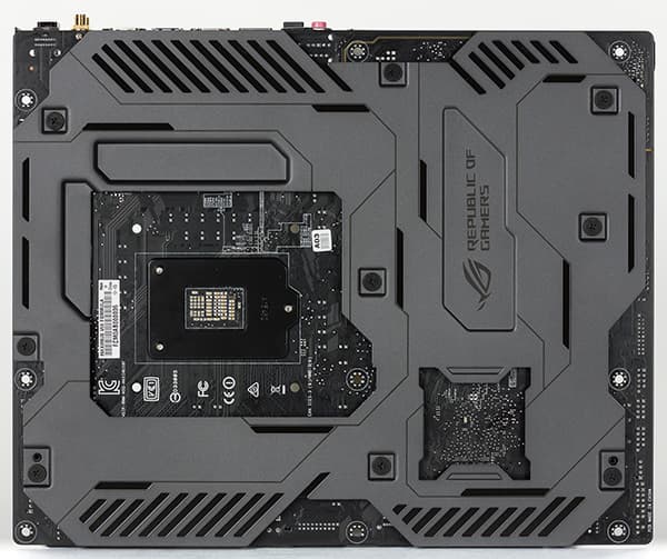 Кожух состоит из двух частей. Снизу к плате крепится металлическая часть кожуха, которая улучшает теплоотвод и имеет контакт (через термоинтерфейс) с элементами регулятора напряжения питания процессора, расположенными с обратной стороны платы.