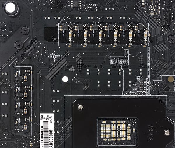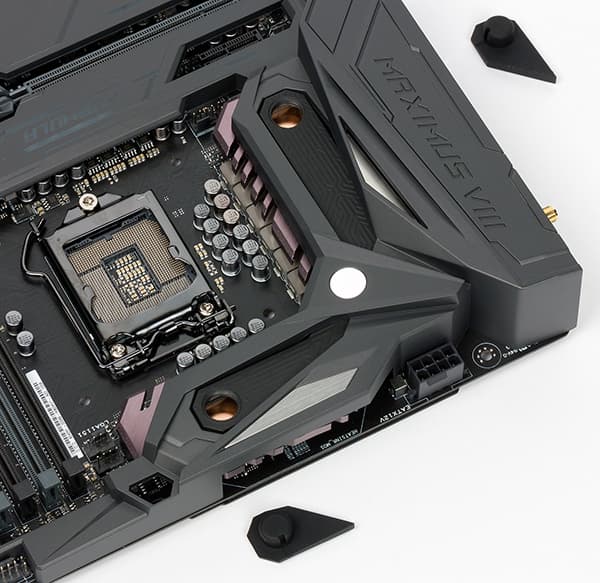 Система охлаждения платы Asus Maximus VIII Formula включает в себя два радиатора. Один радиатор углового типа охлаждает MOSFET-транзисторы, а еще один радиатор закрывает чипсет Intel Z170.