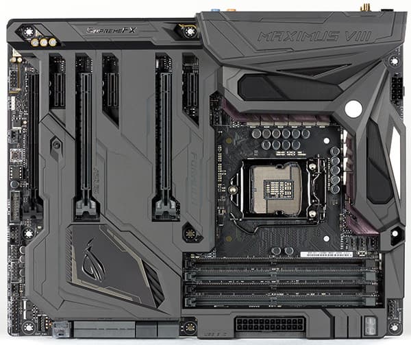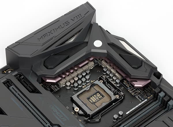 Если говорить о дополнительных особенностях платы Asus Maximus VIII Formula, то среди наиболее значимых можно выделить две: наличие защитного кожуха и настраиваемая RGB-подсветка.