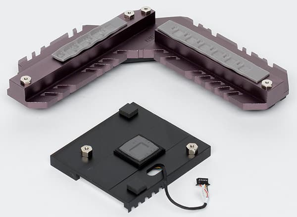Особенность радиатора MOSFET-транзисторов в том, что опционально к нему можно подключить водяную систему охлаждения.(Технология CrossChill EK). Отверстия для водяных патрубков закрыты резиновыми заглушками.