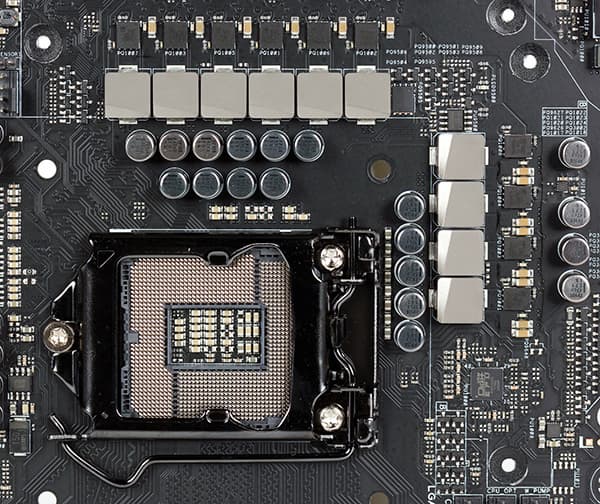 Регулятор напряжения питания процессора очень похож на тот, который имеется на плате Asus Maximus VIII Extreme, но чуть проще (облегченный вариант). Он является 10-канальным, но сколько именно каналов отвечают за питание ядер процессора (VCC), сколько приходится на графическое ядро VCCGT, а сколько отводится для системного агента (VCCSA) — не понятно.
