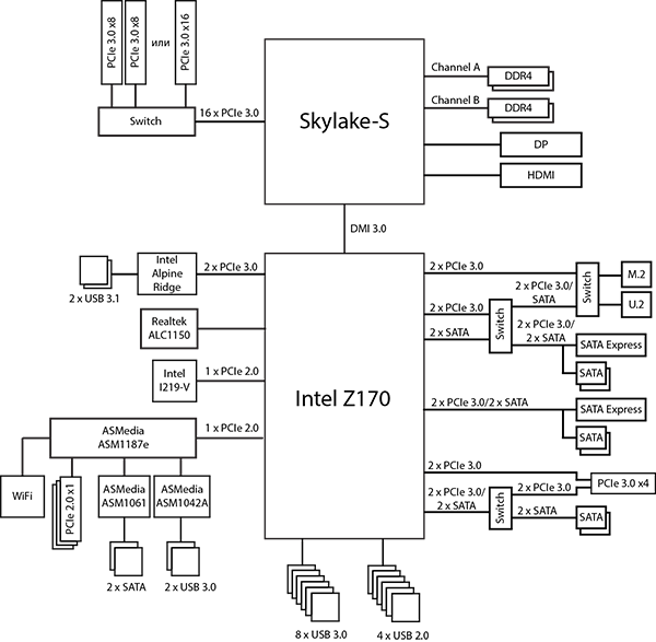 Напомним, что чипсет Intel Z170 имеет до 20 портов (линий) PCI Express 3.0, до 10 портов USB 3.0 и до 6 портов SATA 6 Гбит/с. При этом всего может быть не более 26 высокоскоростных портов (PCIe, USB 3.0 и SATA 6 Гбит/с), причем к 20 портам PCIe 3.0 одновременно можно подключить не более 16 PCIe устройств (контроллеров, разъемов и слотов) с учетом того, что одно устройство может задействовать один, два или четыре порта PCIe.