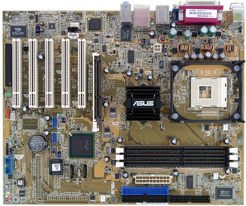 - 3 разъема под DDR SDRAM DIMM (с ограничением чипсета на максимальный объем памяти (2 ГБ) и банков (4, то есть при использовании трех модулей два должны быть однобанковыми));
