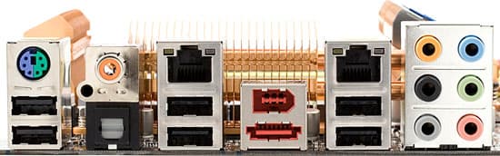 Отметим, что плата удачно реализует компромисс между желанием сохранить порты PS/2 (для самых преданных ценителей старых манипуляторов) и необходимостью разместить на задней панели побольше всевозможных интерфейсных разъемов. Действительно: в данном случае можно без дополнительных карт расширения и выносных планок с портами использовать 2 вида S/PDIF-Out, FireWire и eSATA-II, но при этом сохранить 6 портов USB (ну а более одного устройства с интерфейсом PS/2 сегодня можно обнаружить только у старьевщиков).