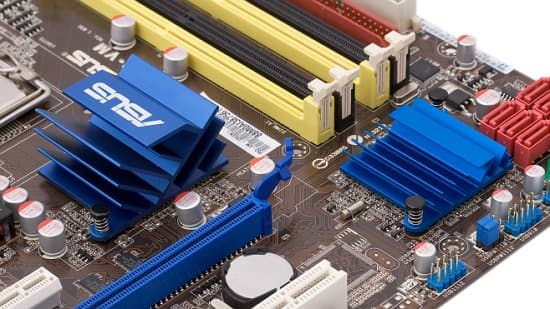 Система охлаждения чипсета выглядит, честно говоря, излишне оптимистично скромной для северного моста с TDP 24 Вт. Нет, до пределов рабочих температур (Tcase max 103 °C) этот мост все равно не добирается, но чисто психологически хочется видеть на нем радиатор, а не невзрачную инсталляцию из профилированного алюминия, прижимаемую к текстолиту двумя пластмассовыми защелками. В конце концов, плохой отвод тепла с чипсета радиатором приводит к повышенной отдаче тепла через металлизированные слои печатной платы, а это нагревает окружающие чипсет компоненты, снижая их ресурс. Разумеется, на ощупь ребра этого радиатора обжигающе горячие, так что мысль о разгоне в применении к ASUS P5Q-VM вроде бы не имеет даже шанса на самозарождение.