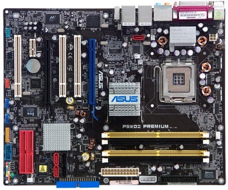 В четырехканальном импульсном стабилизаторе напряжения питания процессора применены 11 конденсаторов по 820 мкФ и 6 по 1000 мкФ, также на плате находится стабилизатор напряжения памяти, включающий 6 конденсаторов по 1000 мкФ. В критических цепях применены в основном электролитические конденсаторы от компаний Sanyo и United Chemi-Con (качественные и надежные). На плате разведены, но не распаяны разъемы для подключения вентиляторов и планки со вторым COM-портом, но версии платы, в которой они были бы задействованы, на текущий момент не существует. Вообще, серия на чипсете i955X кроме P5WD2 Premium представлена всего одной моделью, P5WD2, которая основана на той же PCB, но лишена контроллеров FireWire и дополнительного SATA II, а также гигабитного сетевого адаптера, подключенного к шине PCI Express, и имеет более скромный HDA-кодек и комплект поставки. Размер платы — 305х245 мм (полноразмерный ATX, крепление к корпусу девятью винтами, все края платы жестко фиксированы).