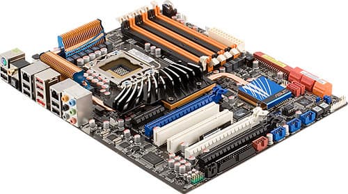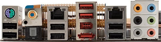 Преобразователь питания процессора типичен для последних плат компании, сочетая 16-канальную схему на 2 полевых транзисторах с пониженным показателем RDS(on) (сопротивлением открытого канала) в каждом канале, полимерные конденсаторы японского производства и дроссели с ферритовым сердечником. Аналогичные конденсаторы и дроссели используются и во всех остальных цепях платы, а кроме того, двухканальная схема применена для стабилизатора питания контроллера памяти и шины QPI в процессоре и трехканальная — для стабилизатора питания собственно модулей памяти. При работе с неполной нагрузкой фирменная технология EPU-6 Engine позволяет, в числе прочих возможностей энергосбережения, уменьшать число активных каналов в ШИМ-контроллере стабилизатора питания, что обеспечивает некоторый дополнительный выигрыш в тепловыделении, хотя и не слишком заметный (по результатам тестов наших коллег).
