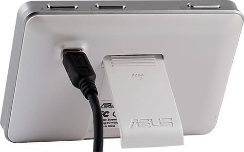 Выносным мы называем этот модуль потому, что без платы он не функционирует. Подключение к плате производится посредством стандартного USB-кабеля (на устройстве разъем mini-USB), к любому порту задней панели. Для манипуляций OC Palm удобнее держать в руках, а после можно положить на стол, прислонить к чему-нибудь или опереть на выдвижную ножку.