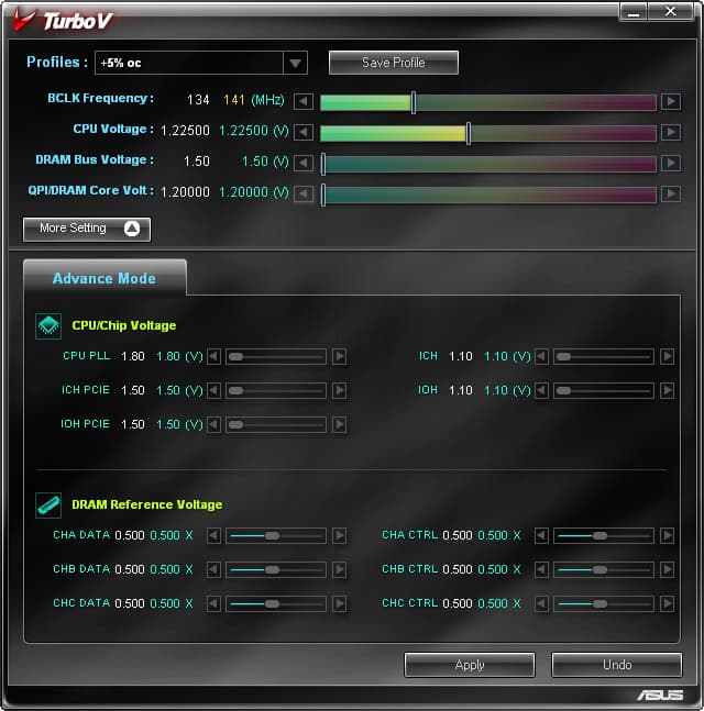 Среди фирменных утилит ASUS, о которых можно прочитать, например, в обзоре модели P5Q Deluxe, нам встретилась одна новая — TurboV. Это вполне привычного вида и функциональности приложение, отвечающее за разгон на лету и индикацию текущих частот и напряжений, подлежащих изменению при разгоне (при использовании Core i7 Extreme Edition дополнительно можно изменять процессорный множитель). Важной особенностью утилиты является возможность ее взаимодействия с программным обеспечением OC Palm, о котором речь пойдет ниже.