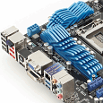 Одним из полезных и приятных следствий большого числа каналов в преобразователе питания (будь они «реальные» или «виртуальные») является низкий нагрев этих компонентов, так как ток течет через большее число полевых транзисторов, дросселей и т. д. Но конечно, поскольку плата всерьез рассчитана на разгон процессоров (включая в данном случае и встроенное в процессор видео), конвертер напряжения для процессора не оставлен без охлаждения. Использованы хорошо уже нам знакомые алюминиевые радиаторы причудливой формы, в меру массивные, то есть не являющиеся чистой декорацией. То же можно сказать и про радиатор на чипсете: при всей незамысловатости его профиля, этот плоский кусок алюминия вполне способен рассеивать жалкие 6 Вт TDP чипсета, не доводя его температуру до критических значений и не создавая при этом помех для установки длинных карт расширения и подключения кабелей. Наконец, полевые транзисторы в цепи питания процессора на оборотной стороне платы тоже прикрыты алюминиевой пластинкой, которая заодно является основанием для крепления «верхнего» радиатора металлическими винтами.