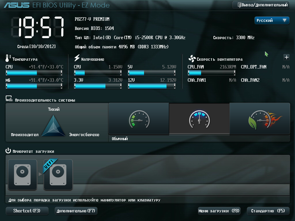 Во многих случаях может оказаться достаточным использование упрощенной одностраничной версии «EZ Mode». В нем отображается информация о текущей конфигурации, есть переключатель общего режима (экономный, нормальный, оптимальный) и выбор загрузочного устройства.