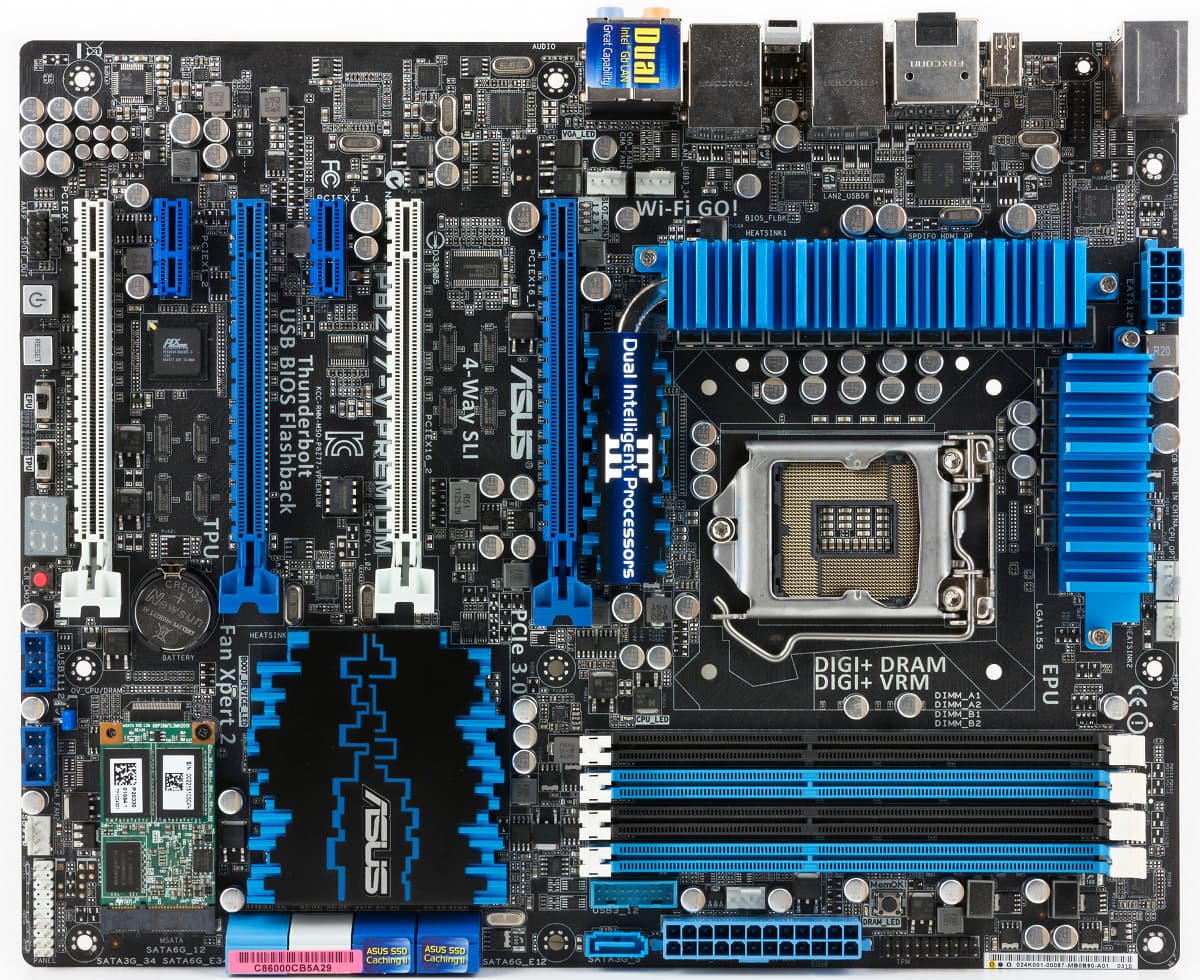 Современные материнские платы представляют собой сложные инженерные произведения, которые невозможно оценить однозначно. Наиболее важным в данном случае будет соответствие конкретным техническим требованиям пользователя и его задач — конфигурация слотов расширения, контроллеры, порты и тому подобное. Материнская плата ASUS P8Z77-V Premium в данном случае интересна, прежде всего, реализацией четырех графических портов, что может быть важно в играх и специализированных приложениях. Вторым ее отличительным признаком является реализация интерфейса Thunderbolt, который, однако, в настоящее время не очень широко распространен в периферийных устройствах. Также можно обратить внимание на шесть дополнительных портов SATA, два сетевых контроллера, два дополнительных USB 3.0 и порт mSATA с установленным накопителем.