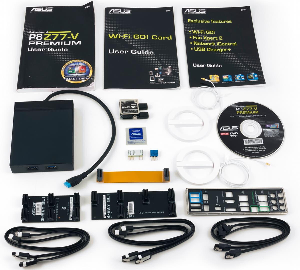 Как уже было понятно по размерам коробки, комплектация данного продукта должна быть интересной. К обычному набору из платы, заглушки на заднюю панель, руководств пользователя (основного и двух по технологиям), диска с драйверами и программами, кабелей SATA (в данном случае два на 3 Гбит/с и четыре на 6 Гбит/с, все с угловыми разъемами с одной стороны и защелками) и наклейки с логотипом компании добавили: комплект Q-Connect для упрощения подключения кабелей корпуса, фирменный беспроводной контроллер (Wi-Fi и Bluetooth) с двумя антеннами, большой и красивый блок с парой портов USB 3.0 для отсека 3,5″ (правда, кабель у него не очень длинный — всего 32 см), гибкий мост SLI для двух видеокарт, жесткие мосты SLI для трех и четырех видеокарт.