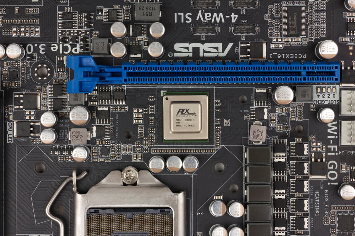 Оставшиеся два места занимают слоты PCIe x1 чипсетного контроллера. Отметим, что эти слоты могут быть заблокированы при установке габаритных видеокарт. Впрочем, если карта только одна, то проблем не будет. Установленная микросхема PLX PEX8608 позволяет использовать одновременно и слоты расширения, и многочисленные установленные на плате дополнительные контроллеры.