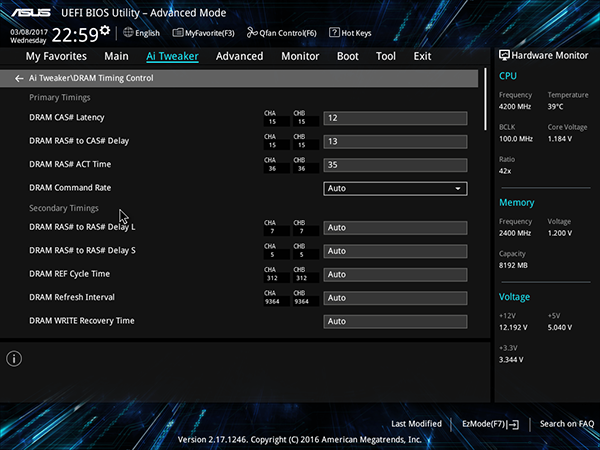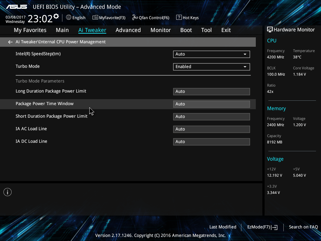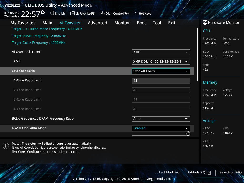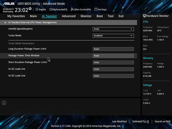Напомним, что чипсет Intel B250 не позволяет разгонять процессор и память. Однако в UEFI BIOS имеется традиционная вкладка Ai Tweaker, предназначенная для разгона процессора и памяти. Возможности изменения частоты тактового генератора BCLK в данном случае не предусмотрено вообще. Коэффициент умножения ядер процессора (в варианте процессора K-серии) изменять можно, причем задавать коэффициент умножения можно как для каждого случая числа загруженных ядер процессора, так и одновременно для всех загруженных ядер процессора. Однако максимальный коэффициент, который можно установить, равен максимальному коэффициенту процессора в режиме Turbo Mode. К примеру, в случае процессора Intel Core i7-7700K это 45.