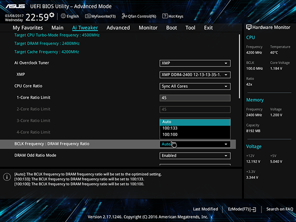 В настройках Ai Tweaker можно также задавать коэффициент BCLK Frequency : DRAM Frequency (100:100, 100:133) и настроить работу модулей памяти.