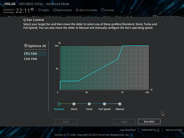 Как и на всех платах Asus, в UEFI BIOS можно настраивать скоростной режим работы вентиляторов, подключаемых к плате. Кроме выбора одного из четырех скоростных пресетов, можно настроить скоростной режим вручную по трем точкам на графике зависимости скорости вращения, задаваемой коэффициентом заполнения управляющих PWM-импульсов, от температуры процессора.
