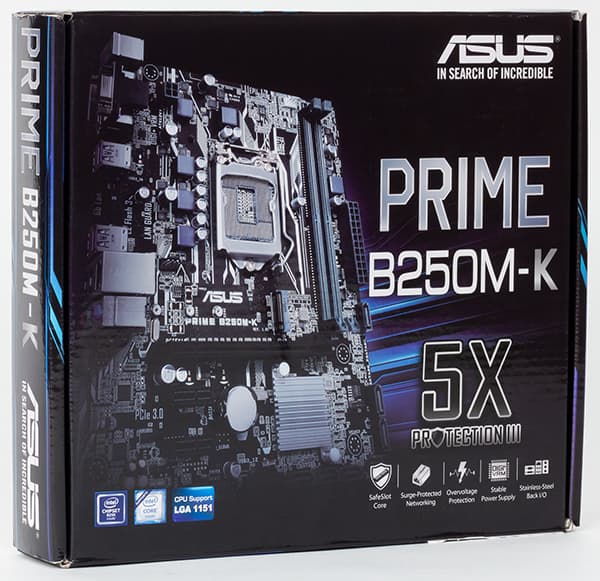 Плата Asus Prime B250M-K поставляется в компактной по размерам коробке, на которой традиционно расписаны все ее особенности.