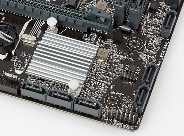 Система охлаждения платы Asus Prime B250M-K состоит всего из одного тонюсенького радиатора на чипсете. Элементы регулятора напряжения питания процессора радиаторами не прикрыты.