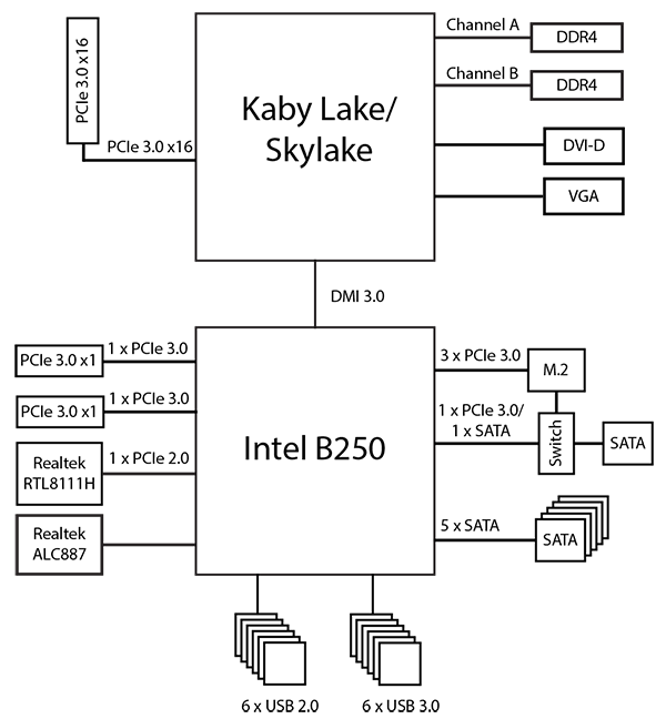 Напомним, что чипсет Intel B250 имеет 25 высокоскоростных портов ввода/вывода (HSIO), в качестве которых могут быть порты PCIe 3.0, USB 3.0 и SATA 6 Гбит/с. (в чипсете Intel Z270 30 HSIO портов). Это 6 портов USB 3.0, 12 портов PCIe и 6 портов SATA (еще один HSIO порт закреплен за сетевым контроллером физического уровня).