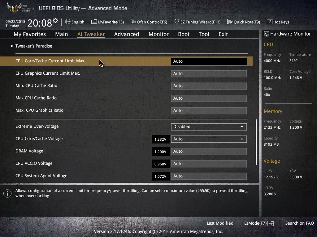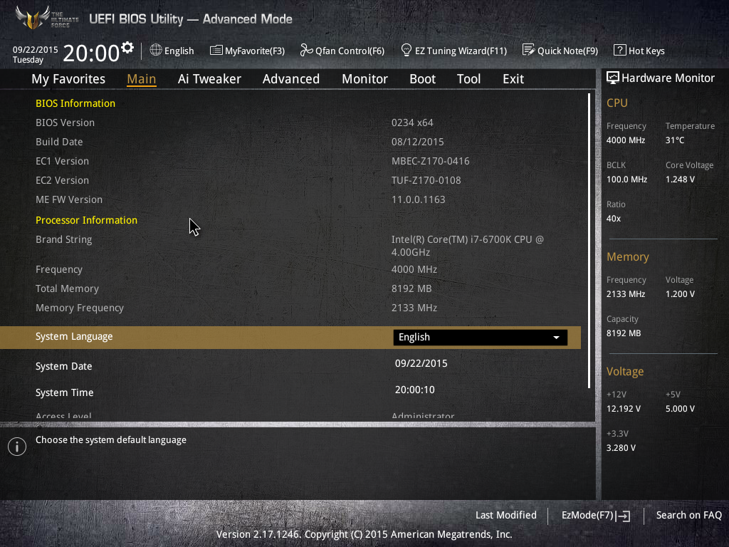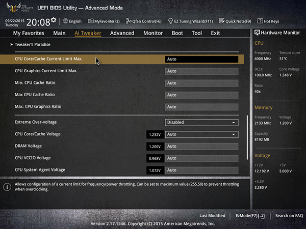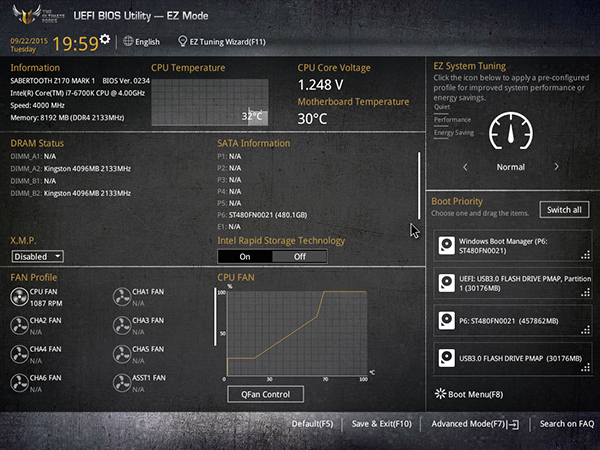 Напомним, что функциональные возможности UEFI BIOS отличаются для разблокированных процессоров K-серии, которые можно разгонять, и для обычных заблокированных процессоров, не поддающихся разгону. Мы тестировали плату Asus Sabertooth Z170 Mark I с процессором Intel Core i7-6700K, а потому описание возможностей BIOS будет относиться именно к разблокированным процессорам.