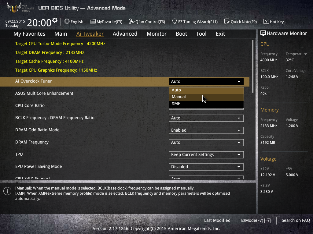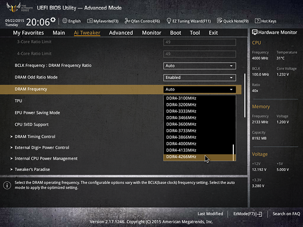 Кроме того, в разделе AI Tweaker можно задать частоту работы памяти. Максимальная частота памяти может быть равной 4266 МГц (при частоте BCLK 100 МГц).
