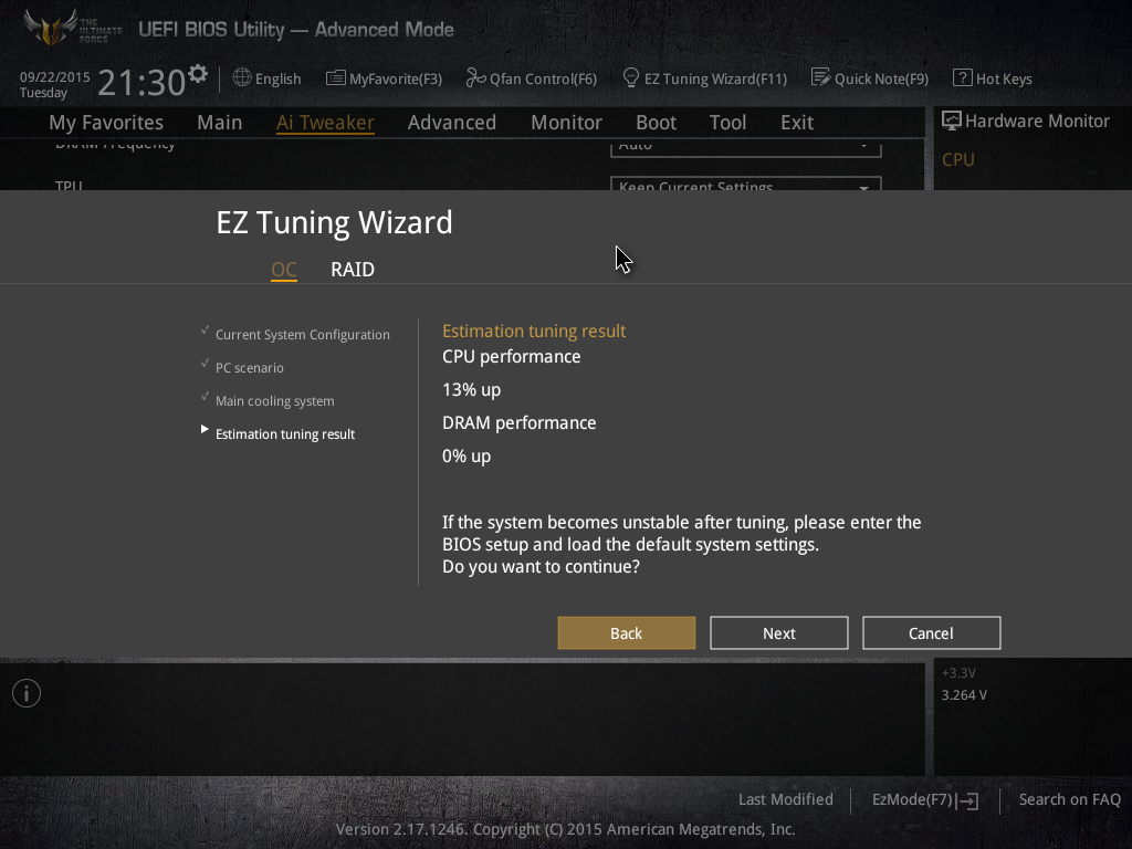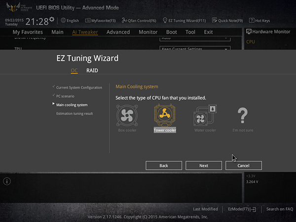 UEFI BIOS платы Asus Sabertooth Z170 Mark I предоставляет также возможность запустить утилиту быстрого разгона EZ Tuning. В пошаговом режиме определяется назначение компьютера, тип системы охлаждения и на основании этих данных предлагается разогнать процессор и память.
