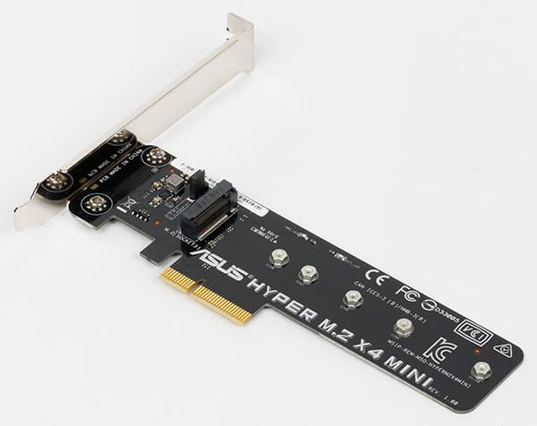 Кроме того, в комплекте есть карта Asus Hyper M.2 x4 Mini, которая устанавливается в слот PCI Express 3.0 x4 и позволяет подключать SSD-накопители с разъемом M.2 и интерфейсом PCIe.