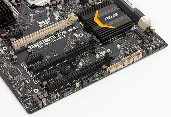 Для установки видеокарт, плат расширения и SSD-накопителей на материнской плате Asus Sabertooth Z170 Mark I имеется один слот PCI Express 3.0 x16, один слот PCI Express 3.0 x8 (в форм-факторе PCI Express x16), один слот PCI Express 3.0 x4 (в форм-факторе PCI Express x16), три слота PCI 3.0 Express x1 и разъем M.2 (PCIe 3.0 x4 и SATA), который позволяет устанавливать накопители типоразмера 2242/2260/2280/22110.