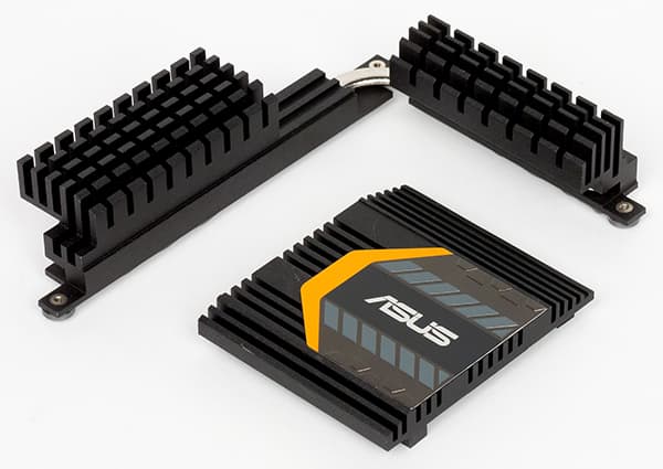 Для охлаждения различных тепловыделяющих компонентов на плате Asus Maximus VIII Gene предусмотрено в совокупности два радиатора. Один отдельный радиатор установлен на чипсете, а другой состоит из двух частей, связанных тепловой трубкой и соединенных в форме буквы «Г». Этот радиатор отводит тепло от MOSFET-транзисторов регулятора напряжения питания процессора.