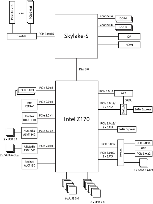Напомним, что чипсет Intel Z170 имеет до 20 портов (линий) PCI Express 3.0, до 10 портов USB 3.0 и до 6 портов SATA 6 Гбит/с. При этом всего может быть не более 26 высокоскоростных портов (PCIe, USB 3.0 и SATA 6 Гбит/с), причем к 20 портам PCIe 3.0 одновременно можно подключить не более 16 PCIe устройств (контроллеров, разъемов и слотов) с учетом того, что одно устройство может задействовать один, два или четыре порта PCIe.