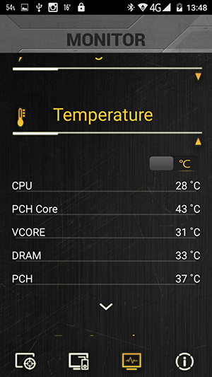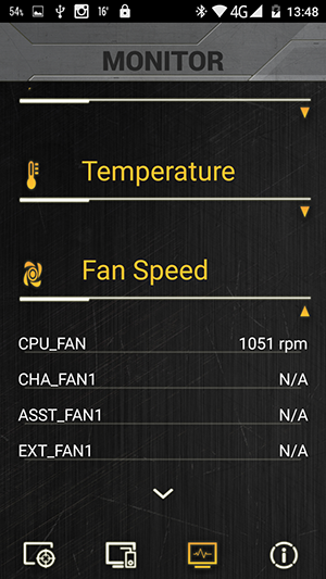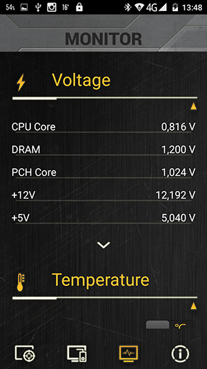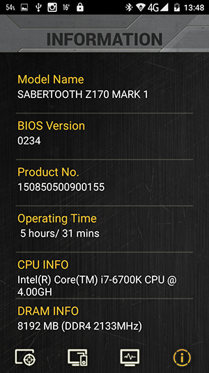 Как мы уже отмечали, на задней панели платы есть специализированный порт USB TUF Detective 2, который предназначен только для подключения смартфонов с установленным приложением Asus TUF Detective 2. Это программное обеспечение позволяет осуществлять мониторинг системы на подключенном к плате смартфоне. Каких-либо ограничений, которым должны удовлетворять смартфоны, в документации не указывается. Однако, как выяснилось, не все так просто. Со смартфоном LG с операционной системой Android 4.1.2, к примеру, данная плата оказалось несовместима. То есть приложение Asus TUF Detective на смартфон устанавливается, но сделать ничего нельзя. А вот китайский смартфон категории NoName с операционной системой Android 5.0 прекрасно заработал с этой платой.