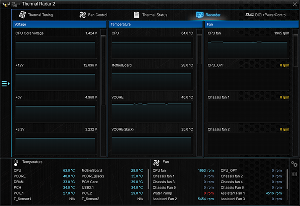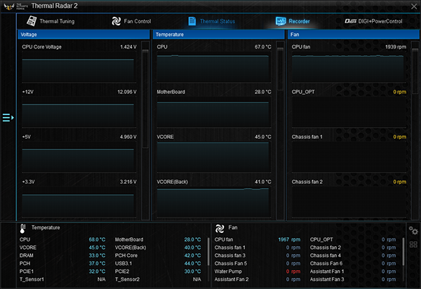 Важно подчеркнуть, что все вентиляторы управляются с помощью специализированной утилиты Asus Thermal Radar 2. Можно, конечно, настроить их работу и через UEFI BIOS, но возможности утилиты Asus Thermal Radar 2 гораздо более широкие.