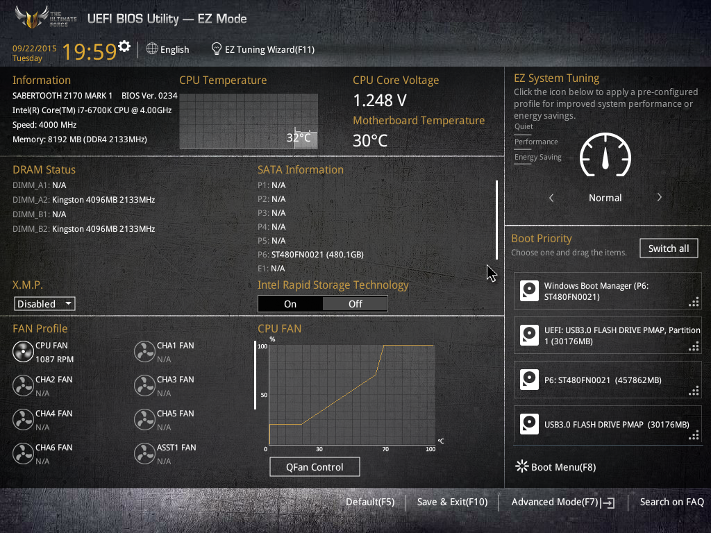На плате Asus Sabertooth Z170 Mark I используется типичный для всех плат TUF-серии UEFI BIOS. По интерфейсу он очень похож на UEFI BIOS, который реализован на плате Asus Sabertooth Z97 Mark I. Отличия лишь в деталях, связанных с различиями чипсетов Intel Z97 и Intel Z170.