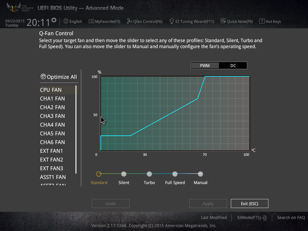 Как мы уже отмечали, в UEFI BIOS предусмотрена возможность настройки скоростных режимов всех вентиляторов, подключенных к плате (Qfan Control). Кроме возможности выбора одного из трех предустановленных скоростных режимов (Standard, Silent, Turbo, Full Speed), можно настроить скоростной режим вручную. При ручной настройке скорости вращения вентилятора имеется возможность задать график изменения скважности управляющих PWM-импульсов от температуры процессора по трем точкам. Но еще раз подчеркнем, что для настройки скоростного режима вентиляторов лучше использовать фирменную утилиту Asus Thermal Radar 2.