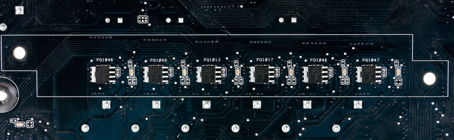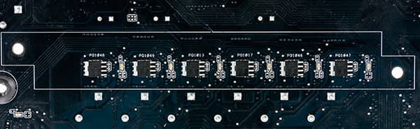 Сами каналы питания построены с применением MOSFET-драйверов IR3535 дискретных MOSFET-транзисторов. Часть MOSFET-транзисторов расположена на обратной стороне платы и контактирует с использованием термопрокладки с металлической теплосъемной пластиной.