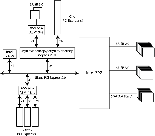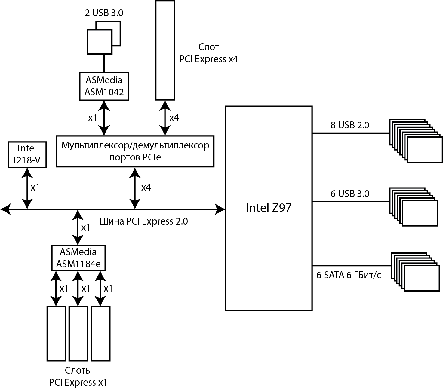 Если посчитать количество контроллеров, разъемов и слотов, использующих порты PCI Express 2.0 чипсета Intel Z97, то получится следующая картина. На слот PCI Express 2.0 x4 и три слота PCI Express 2.0 x1 требуется в совокупности семь портов PCI Express 2.0. Еще один порт PCI Express 2.0 задействует сетевой контроллер. Кроме того, USB 3.0 контроллер ASMedia ASM1042 – это еще один порт PCI Express 2.0. В результате получаем, что всего требуется 9 портов PCI Express 2.0. Но в чипсете Intel Z97 общее количество портов PCI Express 2.0 не может превышать восьми (от шести до восьми портов PCI Express 2.0 с учетом технологии Flexible IO).