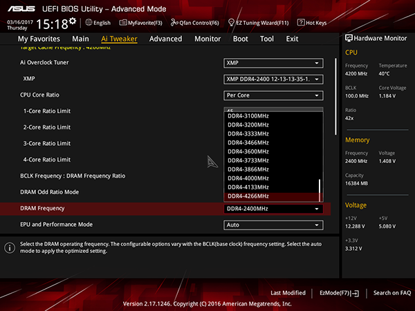 Максимальную частоту модулей памяти DDR4 можно выбрать равной 4266 МГц. Но из за ограничений чипсета максимальная частота памяти все равно будет равна только 2400 МГц.