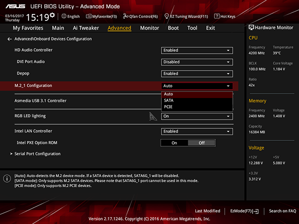 Режим работы разъема M.2_1 можно установить в настройках UEFI BIOS.