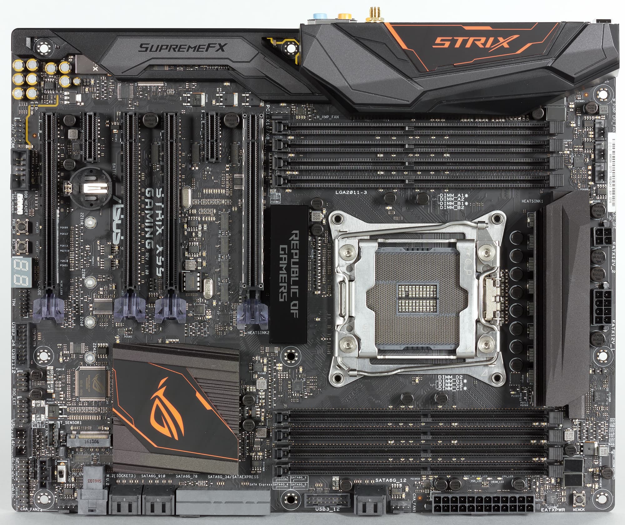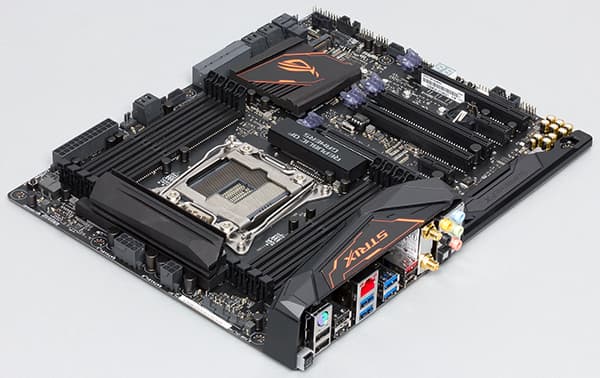 Итак, давайте познакомимся с новинками поближе. Начнем мы с модели Asus Strix X99 Gaming, которая является абсолютно новой моделью платы на чипсете Intel X99. Эта плата пополнила игровое семейство Republic of Gamers (ROG) и теперь в семействе Asus ROG насчитывается три модели на чипсете Intel X99 (есть еще плата Asus Rampage V Extreme и обновленная модель Asus Rampage V Edition 10).