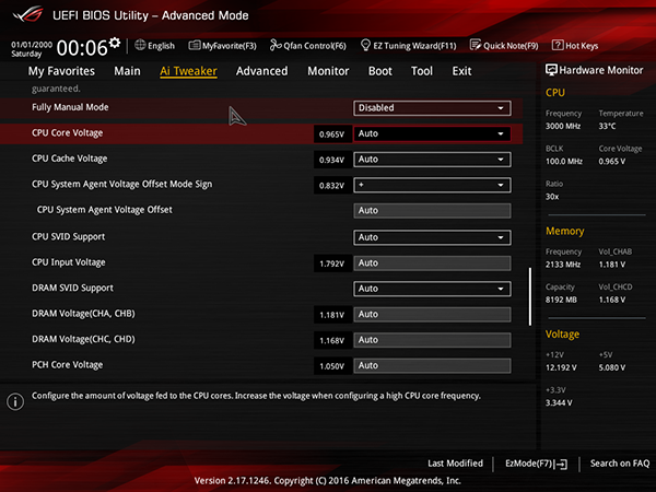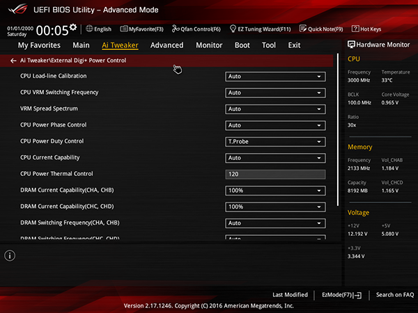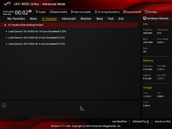 Для разгона процессора и памяти предусмотрена традиционная вкладка Ai Tweaker. Причем на данной вкладке есть и дополнительная опция для выбора пресета разгона процессора Broadwell-E.