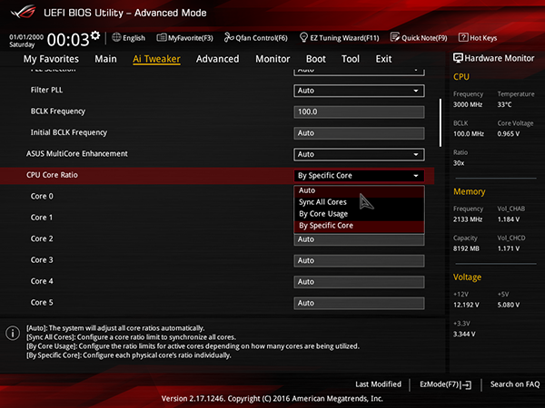 На вкладке Ai Tweaker можно задать задать коэффициент умножения. Причем есть возможность задавать коэффициент для каждого ядра в отдельности, или же для всех ядер одновременно.