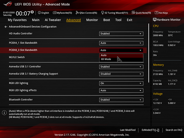 Когда на плату устанавливается процессор с 28 линиями PCIe 3.0 (Core i7-5820K или Core i7-6800K), то то режимы работы слотов следующие: при использовании только первого слота он работает в режиме x16, при использовании первого и третьего слотов они работают в режиме x16/x8, а при использовании первого, третьего и четвертого слотов, они работают в режиме x8/x8/x8.