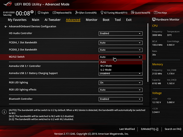 Как уже отмечалось, на плате Asus Strix X99 Gaming имеются разъемы M.2 и U.2, которые реализованы с использованием четырех процессорных линий PCIe 3.0. Разъемы M.2 имеет ключ типа M (Socket 3) и поддерживает установку только PCIe накопителей типоразмера 2242/2260/2280/22110.